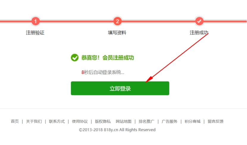 5. 點擊立即注冊后,提示注冊成功,10秒內會自動登陸會員中心,也可以點擊立即登陸,進入會員中心.