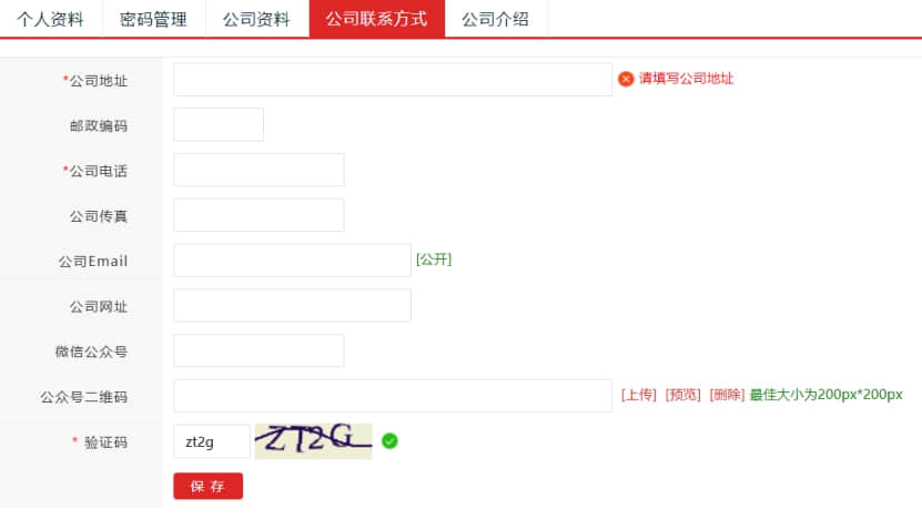 11. 填寫公司聯系地址,這個也會直接展示在網站的聯系方式里面.沒有公司座機電話的,可以填寫手機號.公眾號二維碼,也可以上傳個人微信二維碼.填寫完成后,選擇保存.