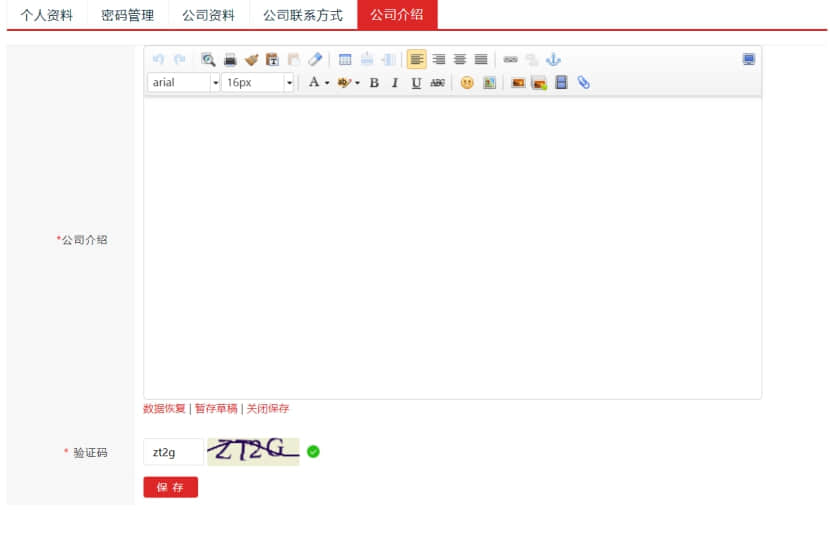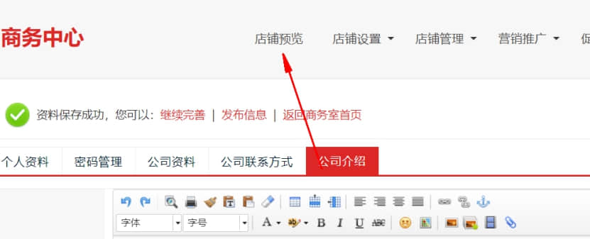 12. 接下來,要填寫公司簡介,也是會直接展現在網站上面的企業介紹里面.點擊保存后,提示資料保存成功.