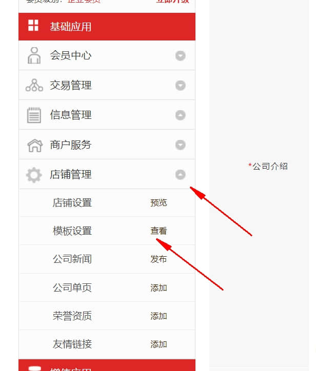 在會員中心,左側基礎應用,選擇店鋪管理,選擇模板設置