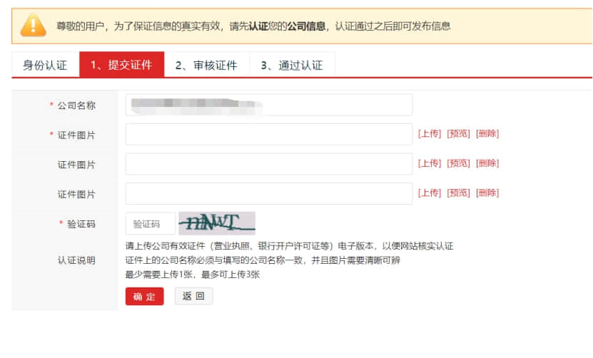17. 現在我們去發布產品,發布產品前,必須要上傳公司的資質材料,進行審核.**欄證件圖片,上傳營業執照副本彩色掃描件,第二欄,可以上傳其它資質文件.輸入驗證碼后,等待平臺審核.