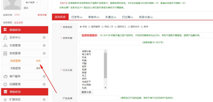 18. 資質審核通過后,在左側,信息管理,供應管理,選擇發布.添加供應產品.錄入完整的產品信息后,選擇發布即可.等審核通過后(營銷寶會員免審核),即可展示出來.提示:產品圖片尺寸為橫向長方形,這樣有利于百度收錄你的產品圖片.發布完產品,還可以選擇哪些產品推薦到首頁.推薦到首頁的產品,即可在首頁看到推薦產品.