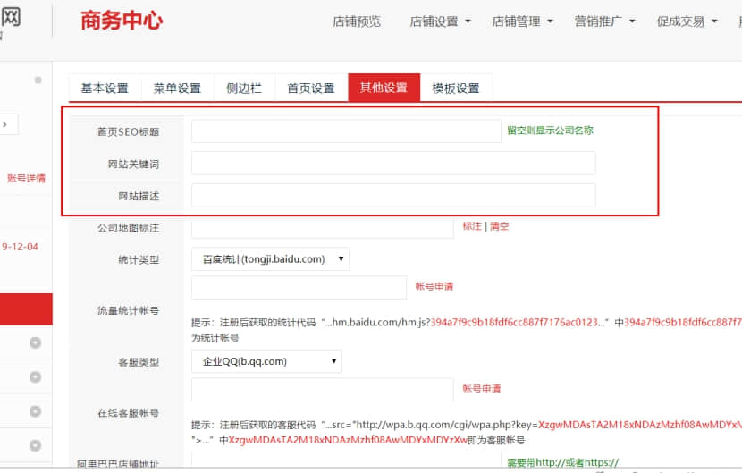 19. 以上操作,基本一個網站已經形出來了.如果你對網站優化感興趣,可以教你幾個優化設置知識.當你升級成為營銷寶會員后,選擇店鋪設置,點選其他設置,即可進入網站設置中心.這里就可以錄入你想的SEOTDK內容.還有更多彩蛋,等你去發現.